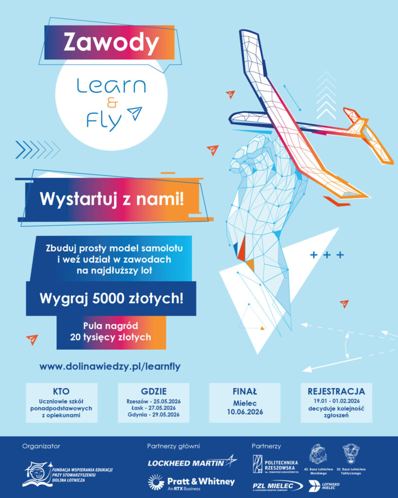 Rozpoczynamy 5 edycję ogólnopolskich zawodów Learn&Fly, które są skierowane do uczniów szkół ponadpodstawowych i polegają na budowie prostego modelu latającego, zaprezentowaniu go przed Jury i podejściu do konkurencji na najdłuższy lot. Zwycięzcy mogą wygrać nagrody finansowe do 5000 zł, a pula wszystkich nagród wynosi ponad 20 000 zł.
