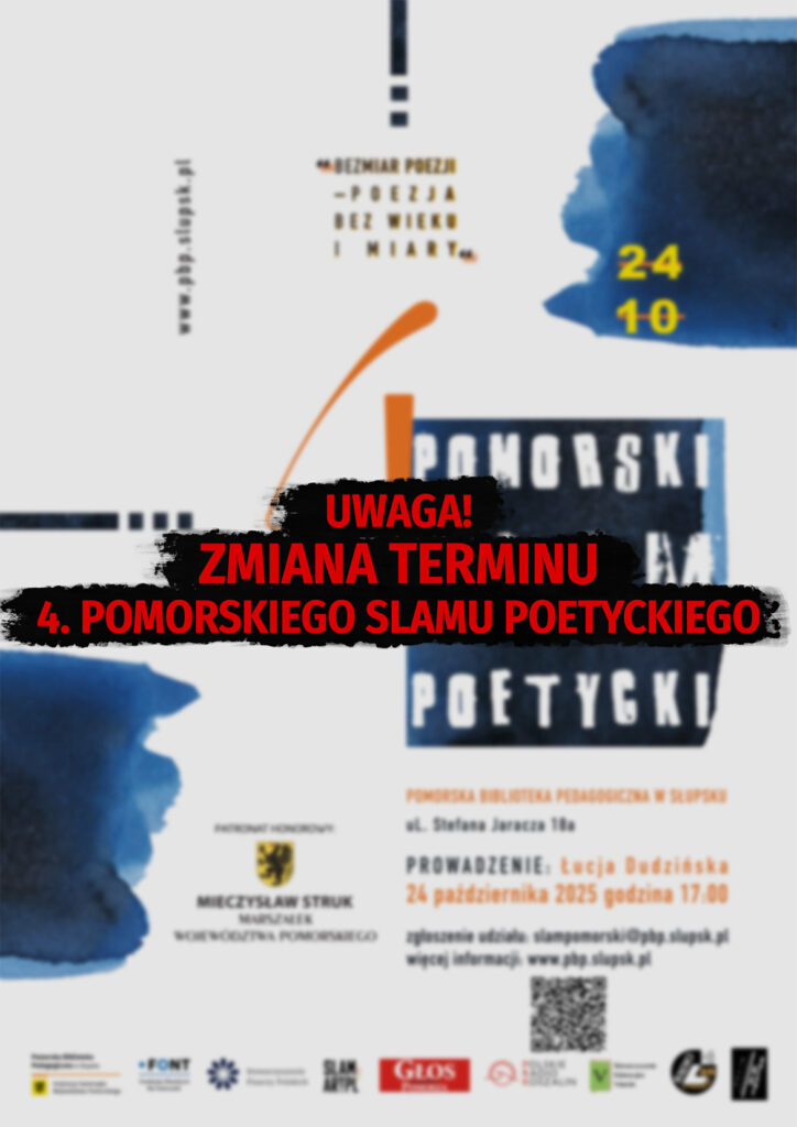 * Pragniemy z przykrością poinformować, iż z przyczyn niezależnych od organizatora IV Pomorski Slam Poetycki zaplanowany na 24.10.2025 zostanie przeniesiony na marzec 2026 r.