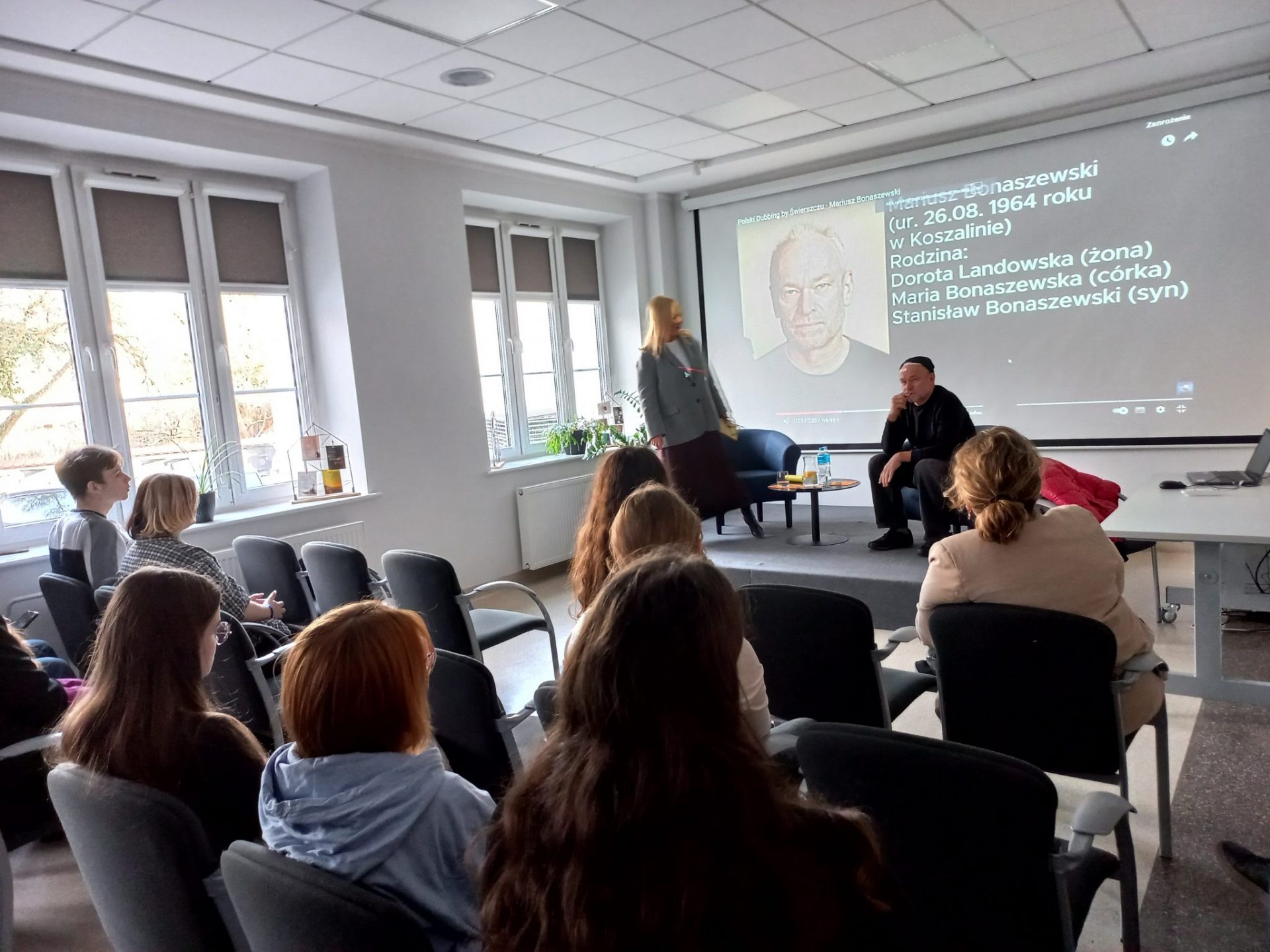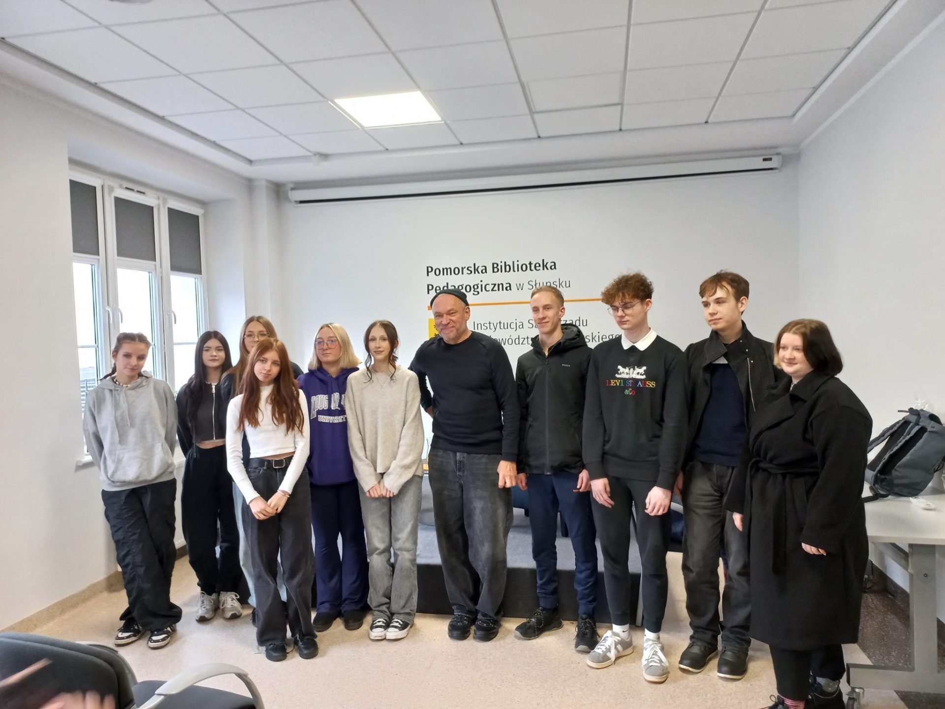 Dnia 25.11.2024 r. odbyło się spotkanie autorskie z p. Mariuszem Bonaszewskim – absolwentem warszawskiej Państwowej Wyższej Szkoły Teatralnej im. Aleksandra Zelwerowicza, aktorem teatralnym i filmowym, którego korzenie związane są ze Słupskiem.