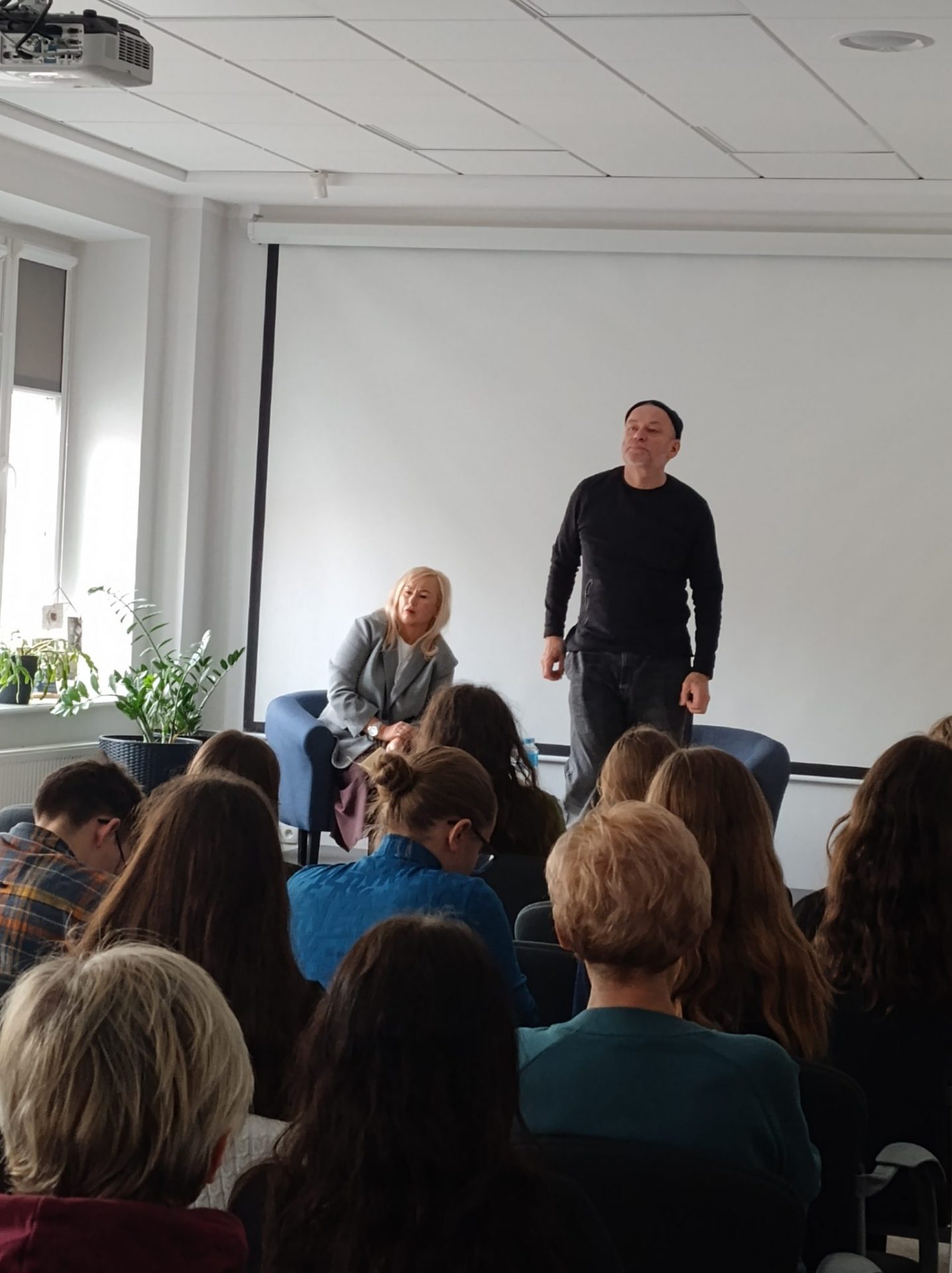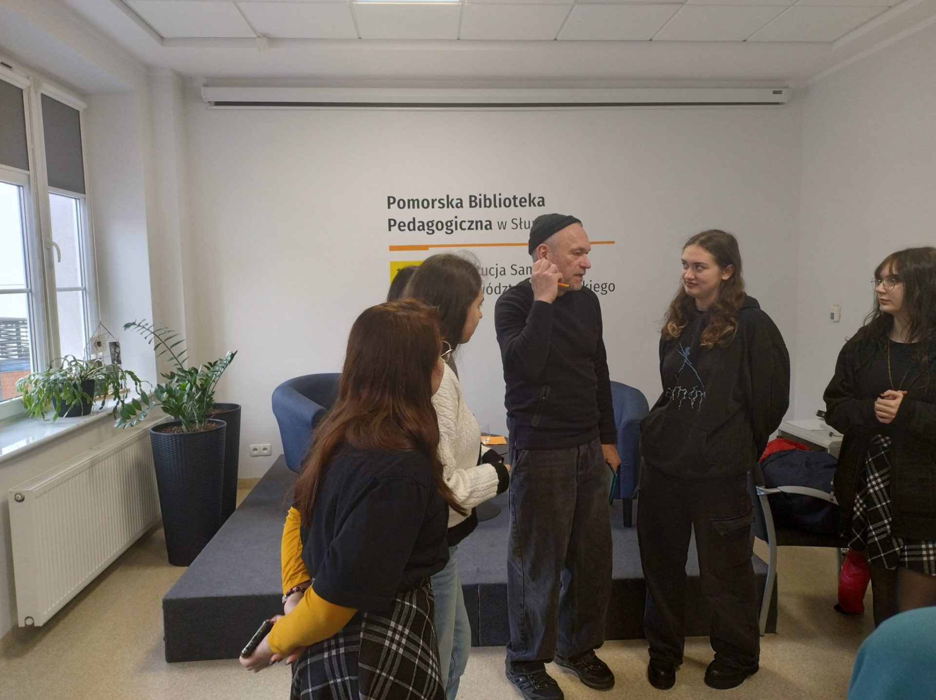 Uczniowie szkół ponadpodstawowych w Słupsku – LO I, LO II, LO IV, LO V, Zespołu Szkół „Elektryk”, Zespołu Szkół Budowlanych i Kształcenia Ustawicznego mieli okazję poznać drogę kariery artysty, z zainteresowaniem uczestniczyli w rozmowie.